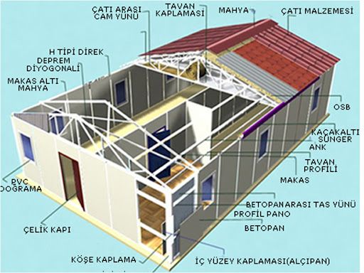 Hazır Prefabrik Prefabrik Ev Teknik Özellikleri; Duvar Yüksekliği: 250 cm Dış Duvar Kalınlığı: 10 cm Fibercement (Betopan) + EPS Strafor+Fibercement İç Duvar Kalınlığı: 6 cm Fibercement (Betopan )+ EPS Strafor+Fibercement Duvar Panel Sistemi: Pres Panel Çatı Kaplaması: Boyalı Trapez Sac Çatı İzolasyon: 10 cm eartwool Çamyünü Şilte Dış Kapı: Çelik Kapı İç Kapı: Amerikan Panel Kapı Pencereler: Çift Cam PVC -Beyaz Elektrik Tesisatı: Sıva Üstü Sıhhi Tesisat: Sıva Üstü